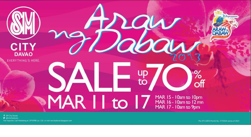 For inquiries, please call 297.6998. Like SM City Davao on Facebook and follow @smcitydavao on Twitter for event and promo updates.