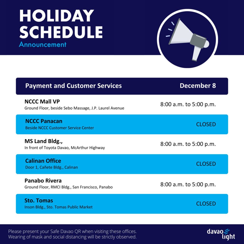 Davao Light & Power Holiday Schedule Office and Payment Centers