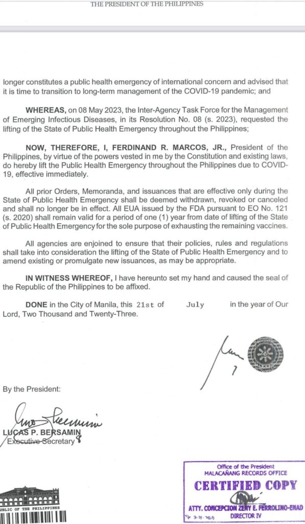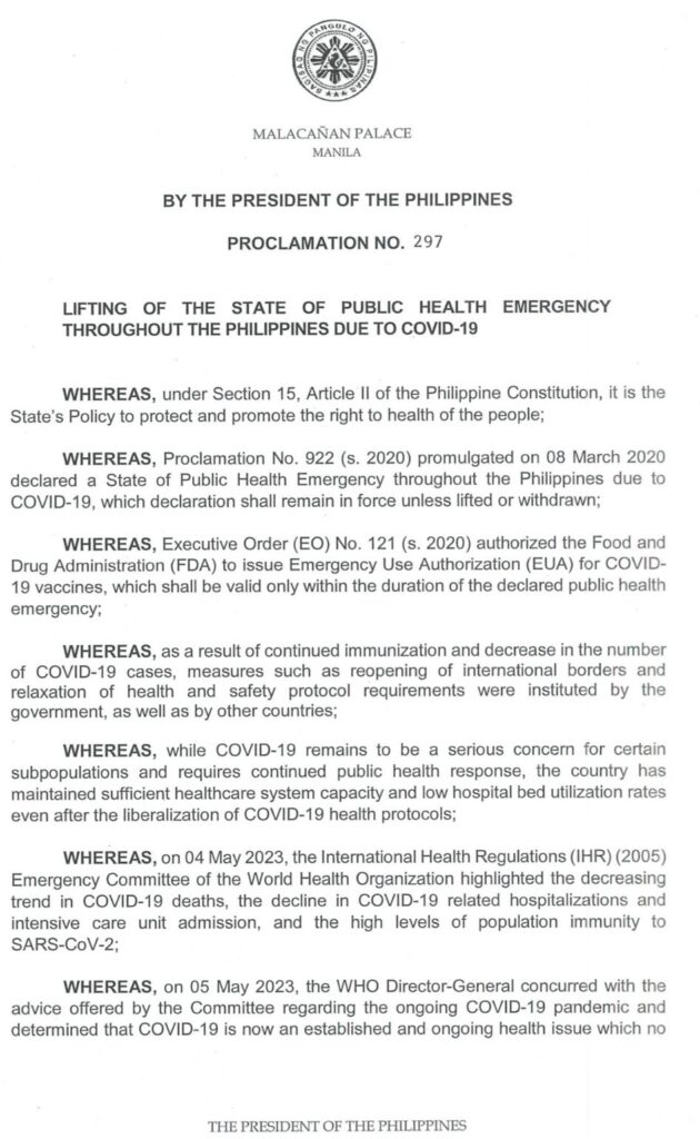 Malacanang announced the State of Public Health Emergency throughout the Philippines due to COVID-19 has been lifted by President Ferdinand “Bongbong” Marcos Jr. on July 21, 2023 through Proclamation No. 297.