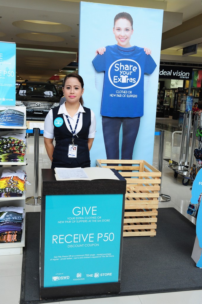 Share your Extras booths are found at SM Stores nationwide. Donors will be entitled to a P50 coupon with a minimum P500 single receipt purchase of regular priced ladies’, men’s and children’s apparel at The SM Store until March 31, 2016.