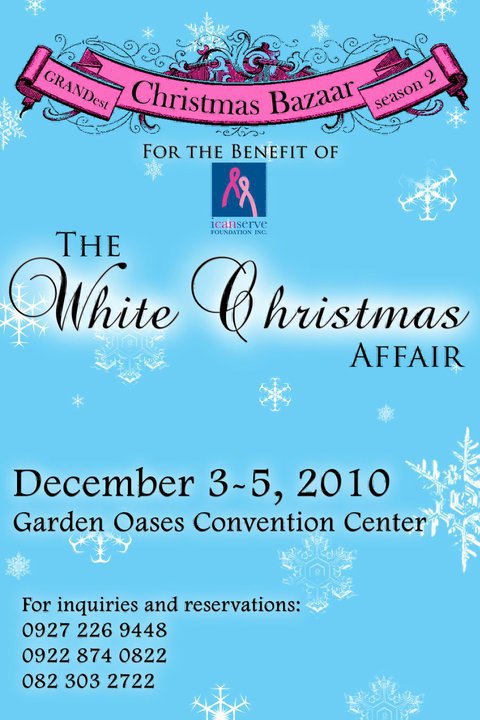 For it’s second year, do not miss the White Christmas Bazaar II 2010 Garden Oases Convention Center Davao City that starts today December 03 to 5, 2010. I wish we can drop by there this time around. We missed the first one last year. We have been to the Christmas Bazaar in Davcon last week. I hope this one have more and better choices for Christmas bazaar shoppers in town this holiday season.